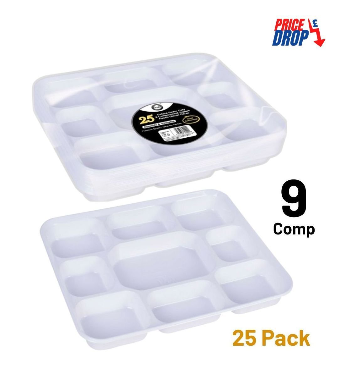 25pc deluxe heavy-duty 9 compartment square plastic dinner plates