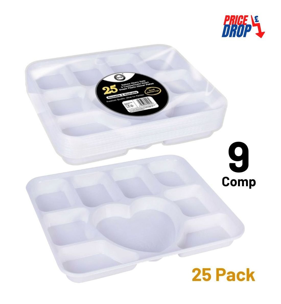 25pc deluxe heavy-duty 9 compartment heart shape plastic dinner plates